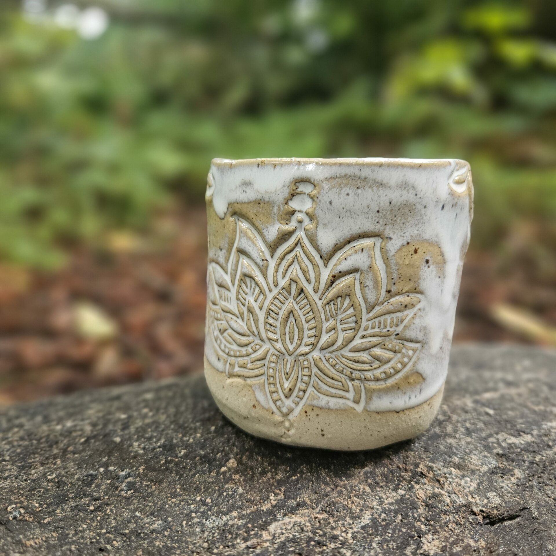 Die sorgfältig von Hand getöpferte Tasse wurde in einer kleinen Töpferei in Sachsen gefertigt. Die harmonische Naturglasur in warmem Creme, Ocker und Weiß fließt sanft über die Oberfläche und macht jede Tasse zu einem einzigartigen Einzelstück. Das eingravierte Lotusmotiv – Symbol für Reinheit, Entwicklung und innere Ruhe – schmückt die Vorderseite und erinnert dich bei jedem Schluck an deine Intention.